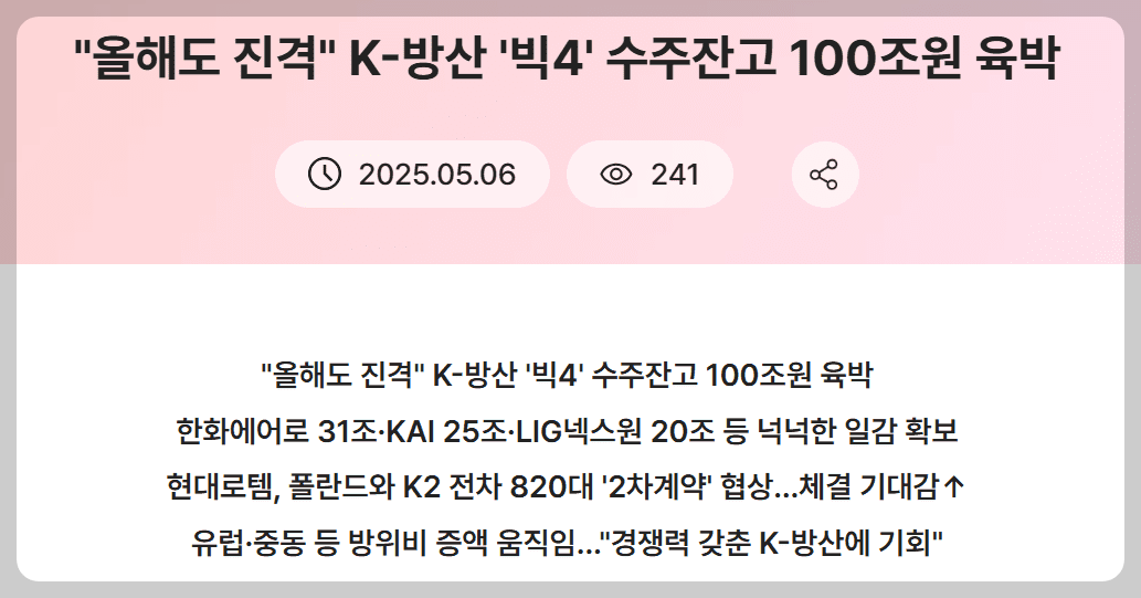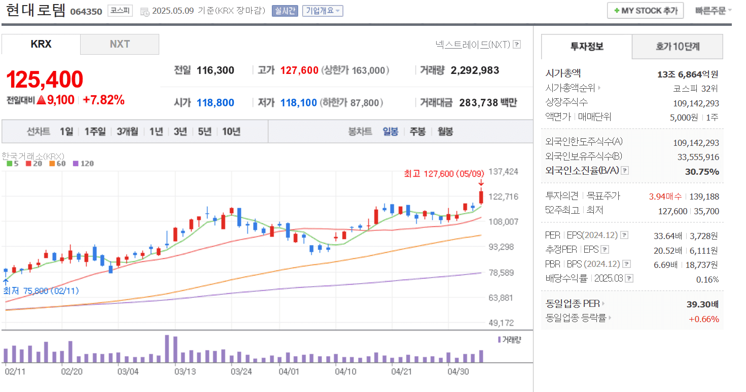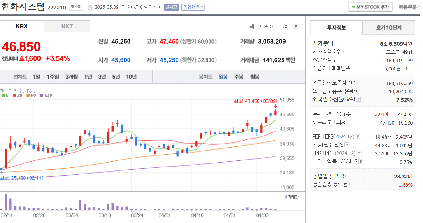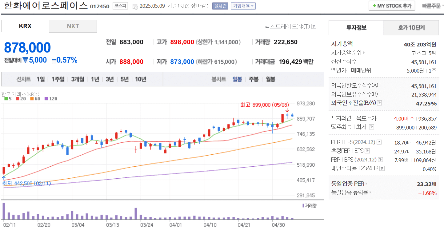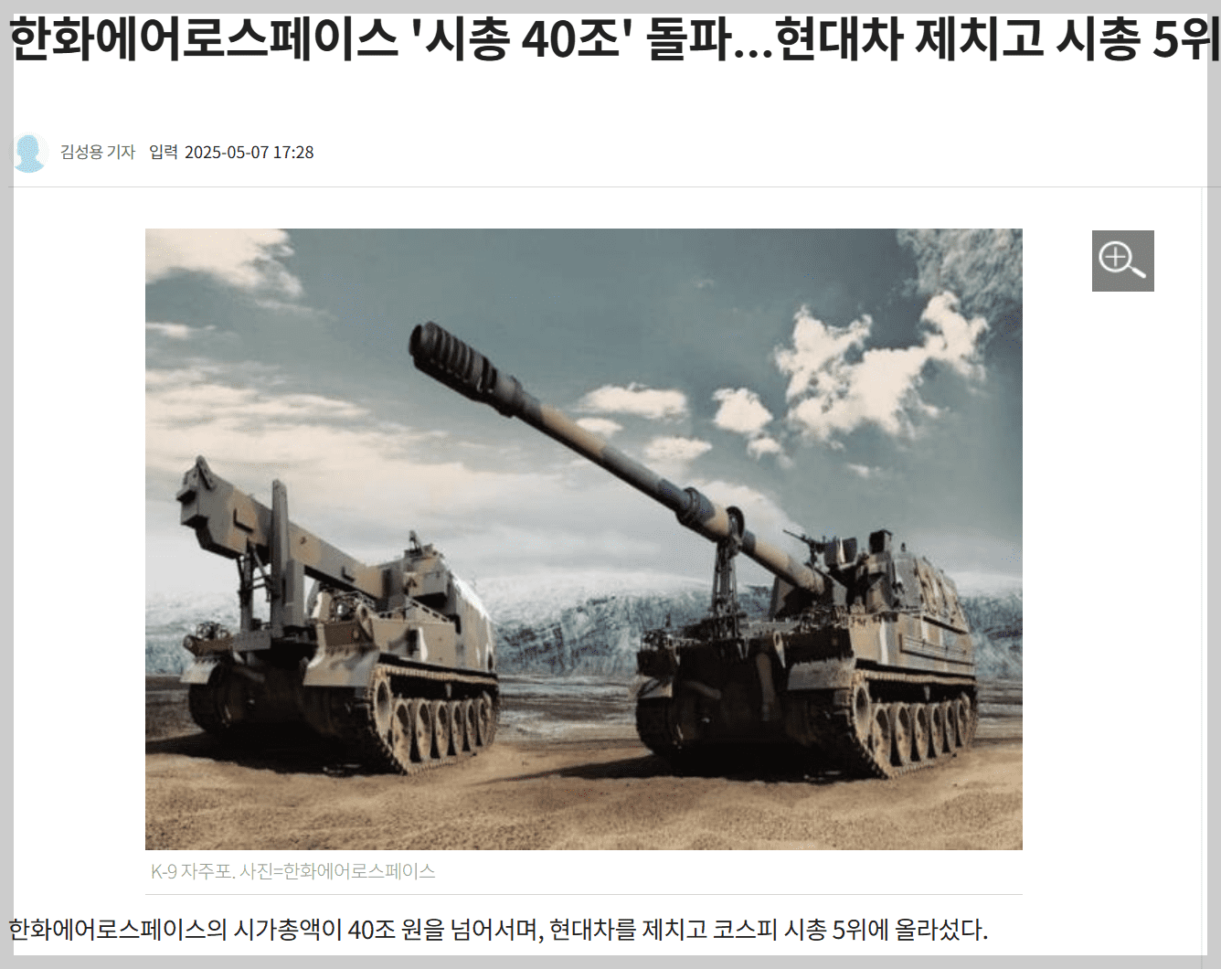 한화에어로스페이스의 시가총액이 2025년 5월 7일 40조를 돌파하며 현대차를 제치고 시총 5위를 달성하였습니다. 한화에어로스페이스는 많은 증권사에서 목표가 920,000원~1,200,000원을 설정하였습니다. 목표가를 상향 설정한 이유로는 유럽 방위비 증가 수혜, 비수기가 무색한 실적, 조기 납품 가능성 등을 들었습니다. 이러한 호실적과 훈풍은 한화에어로스페이스뿐만 아니라 한국의 방산 관련주 전체에 영향을 끼치고 관련주들이 동반 상승하고 있습니다.
