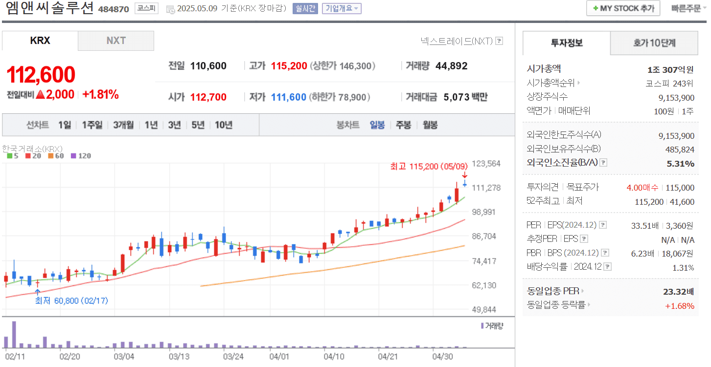 -엠앤씨솔루션은 두산으로부터 물적분할되어 2020년에 설립되었습니다. 구동 안정화 및 정밀제어 기술을 바탕으로 지상, 유도, 해상, 항공, 우주 분야의 구동장치, 유압장치, 유압시스템을 공급하는 방산업체입니다. 2022년 매출액 1200억원, 2024년 매출액은 2828억원, 2025년은 4012억원 예상되고있습니다. 글로벌 주요 수출 품목의 핵심 부품 생산을하고있으며 2025년 수주잔고 1조원 이상 전망하고있습니다.