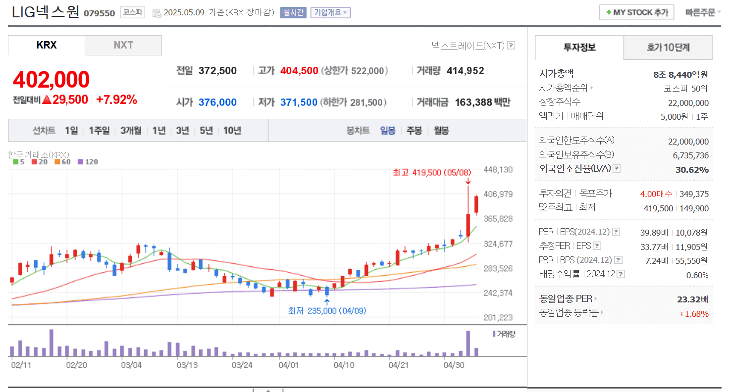 - LIG넥스원의 매출액은 2022년 2조2208억원, 2023년 2조3086억원, 2024년 3조 2763억원, 2025년(예상) 3조 8999억원으로 꾸준히 증가 중입니다. 영업이익률 또한 수익률 개선으로 증가 중입니다. 탄탄한 내수 기반에 더해지는 수출 수주 잔고 증가로 인한 호황을 누리고 있습니다. 최근 리포트에서는 42만~ 45만원 사이로 매수의견이 지배적입니다.