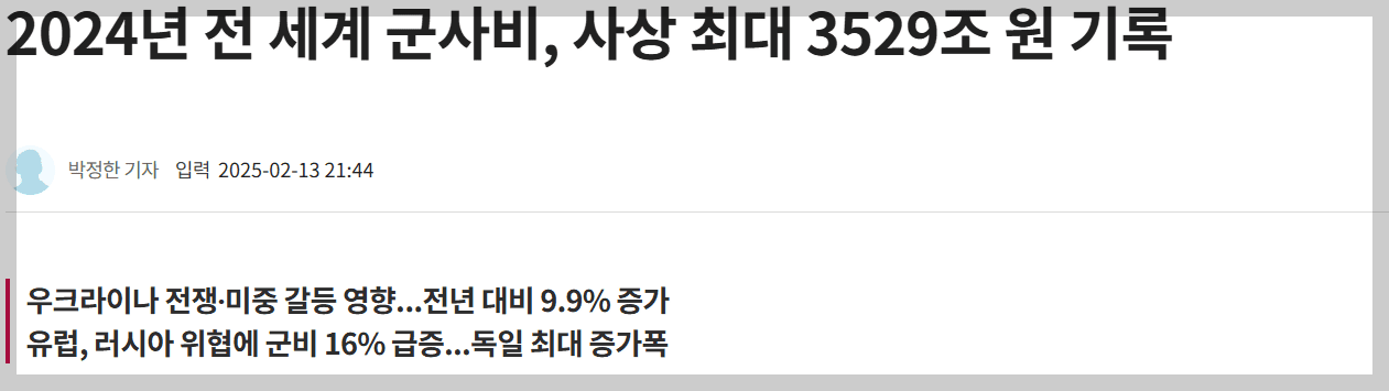 우크라이나 전쟁, 미중 갈등, 트럼프의 자국주의 등 불안한 세계정세에 따라 각국의 국방비 편성이 크게 증가하는 추세에 있습니다.