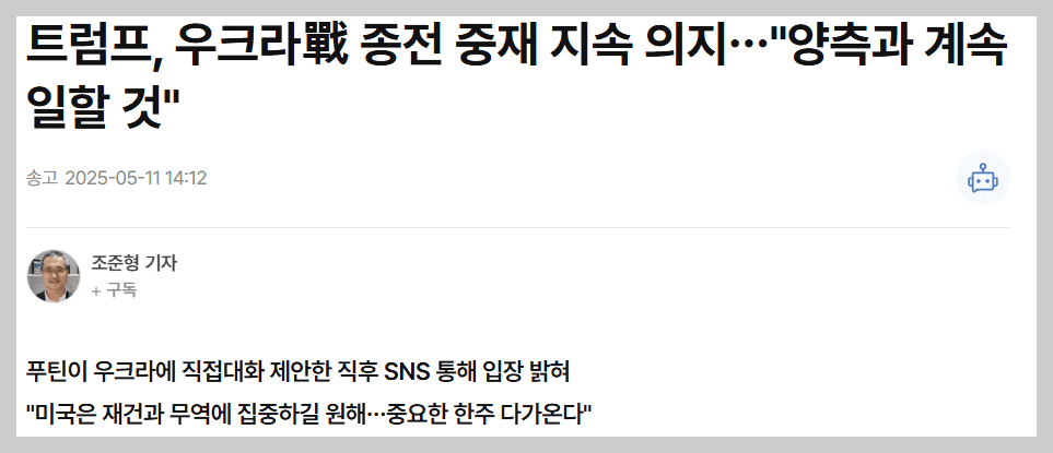 현지시간 2025년 5월 11일 블라디미르 푸틴 러시아 대통령이 우크라이나에 15일 튀르키예 회담 제안을 하였습니다. 이날 트럼프 미국 대통령은 SNS에 "러시아와 우크라이나에 위대한 날일 것", " 나는 양측과 함께 계속 일할 것"이라며 회담에 지지를 보냈습니다. 젤렌스키 우크라이나 대통령은 푸틴의 회담 제안에 푸틴 대통령의 직접 대화를 제시하며 회담 참석을 요청하였습니다.