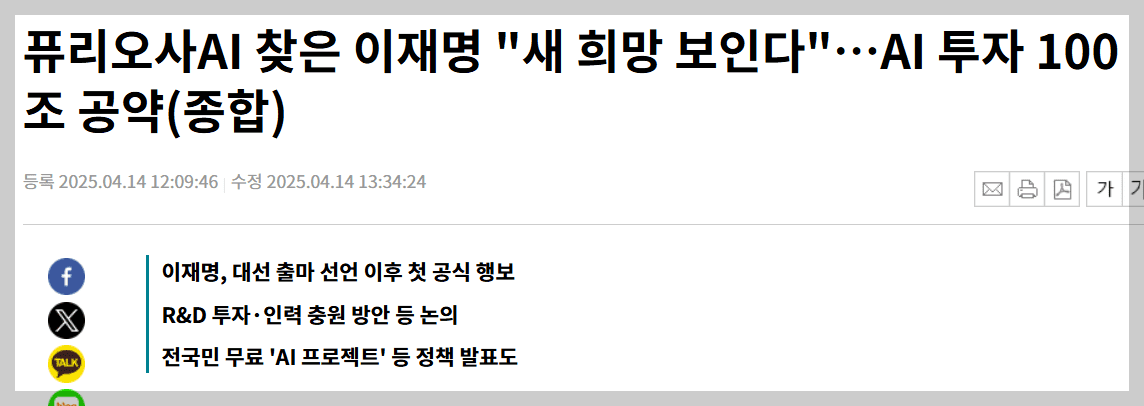 -이재명 후보의 대선 출마 선언 이후 첫 공식 행보로 '퓨리오사ai'를 찾았습니다. 연구개발(R&D) 투자와 인재 육성 방안 등을 백준호 대표, 구본철*이주윤 연구원등과 함께 비공식 간담회를 진행하였습니다. 이재명 캠프의 대변인은 이날 퓨리오사AI를 "글로벌 AI 반도체 시장에서 한국산 시룰력 저력을 보여주고 있는 스타트업", "한국AI 반도체 양산", "K-엔비디아 육성 정책" 등과같이 표현하였습니다. 이날 AI 산업에 100조원을 투자하고 국가AI 데이터 클러스터를 조성하자는 AI 정책*공약을 발표하였습니다.