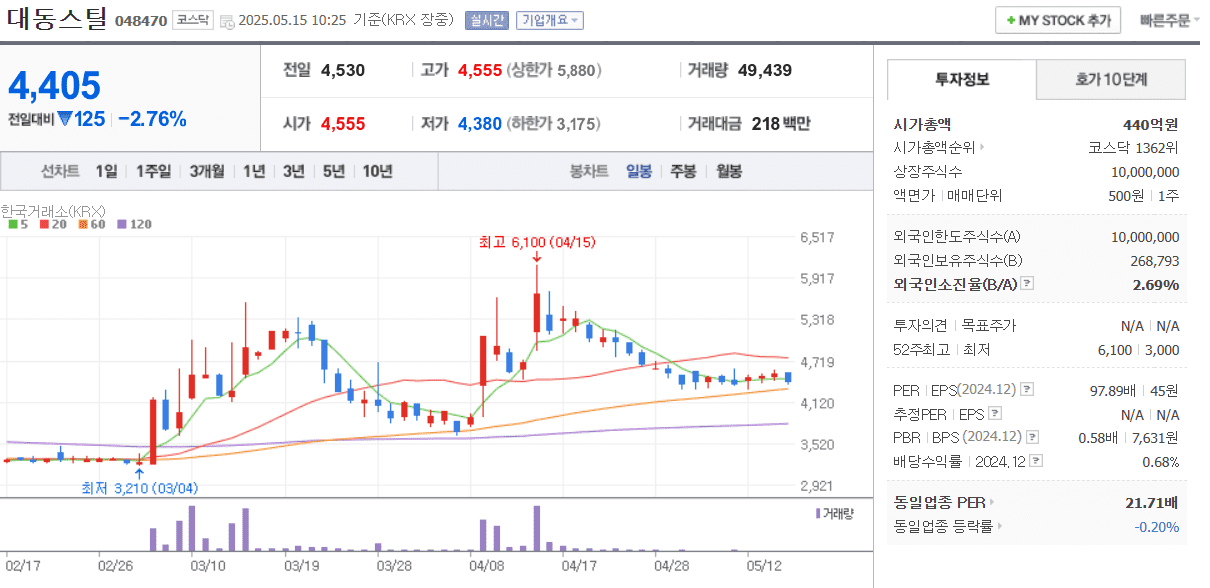 - 대동스틸은 철강제 유통업체로 포스코 열연제품 지정판매점입니다. 포항과 인천에 코일 서비스 설비 5기를 보유한 종합 철강재 서비스 센터로 전국 유통망을 보유하고 있습니다. 대동스틸은 한덕수 권한대행의 알래스카 프로젝트에 대한 본격적인 협의 발언 등에 반응하여 강한 움직임을 보여주는 알래스카 LNG 관련주 중 하나입니다.